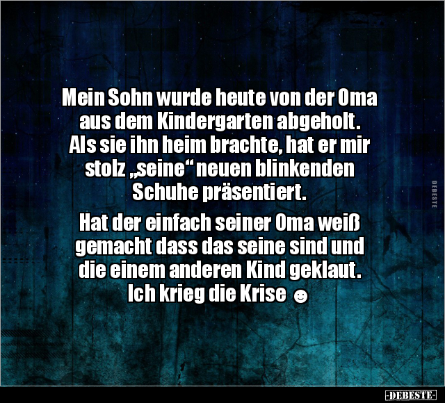 Mein Sohn wurde heute von der Oma aus dem Kindergarten abgeholt. Als sie ihn heim brachte, hat er mir stolz „seine“ neuen blinkenden Schuhe präsentiert. Hat der einfach seiner Oma weiß gemacht dass das seine sind und die einem anderen Kind geklaut. Ich krieg die Krise ☻