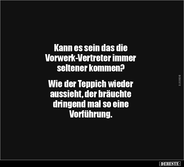 Kann es sein das die Vorwerk-Vertreter immer seltener kommen? Wie der Teppich wieder aussieht, der bräuchte dringend mal so eine Vorführung.