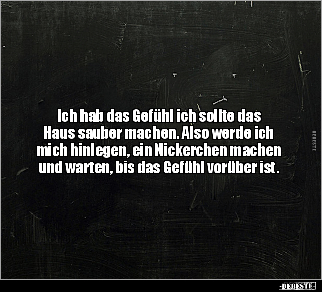Ich hab das Gefühl ich sollte das Haus sauber machen. Also werde ich mich hinlegen, ein Nickerchen machen und warten, bis das Gefühl vorüber ist.