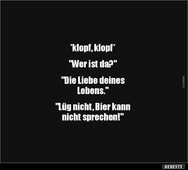 *klopf, klopf* "Wer ist da?" "Die Liebe deines Lebens." "Lüg nicht, Bier kann nicht sprechen!"