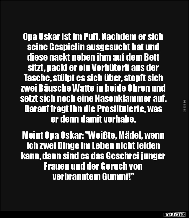 Opa Oskar ist im Puff. Nachdem er sich seine Gespielin ausgesucht hat und diese nackt neben ihm auf dem Bett sitzt, packt er ein Verhüterli aus der Tasche, stülpt es sich über, stopft sich zwei Bäusche Watte in beide Ohren und setzt sich noch eine Nasenklammer auf. Darauf fragt ihn die Prostituierte, was er denn damit vorhabe. Meint Opa Oskar: "Weißte, Mädel, wenn ich zwei Dinge im Leben nicht leiden kann, dann sind es das Geschrei junger Frauen und der Geruch von verbranntem Gummi!"