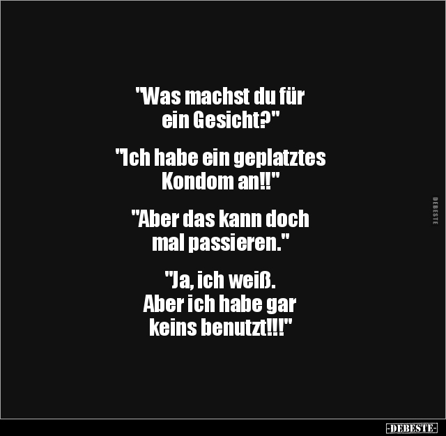 "Was machst du für ein Gesicht?" "Ich habe ein geplatztes Kondom an!!" "Aber das kann doch mal passieren." "Ja, ich weiß. Aber ich habe gar keins benutzt!!!"