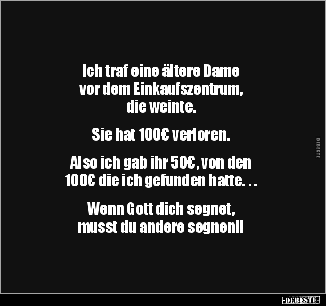 Ich traf eine ältere Dame vor dem Einkaufszentrum, die weinte. Sie hat 100€ verloren. Also ich gab ihr 50€, von den 100€ die ich gefunden hatte. . . Wenn Gott dich segnet, musst du andere segnen!!