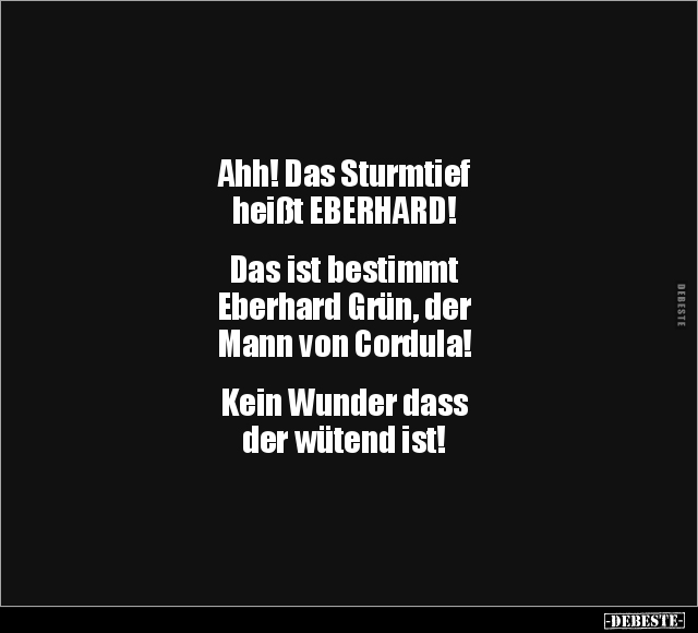 Ahh! Das Sturmtief heißt EBERHARD! Das ist bestimmt Eberhard Grün, der Mann von Cordula! Kein Wunder dass der wütend ist!