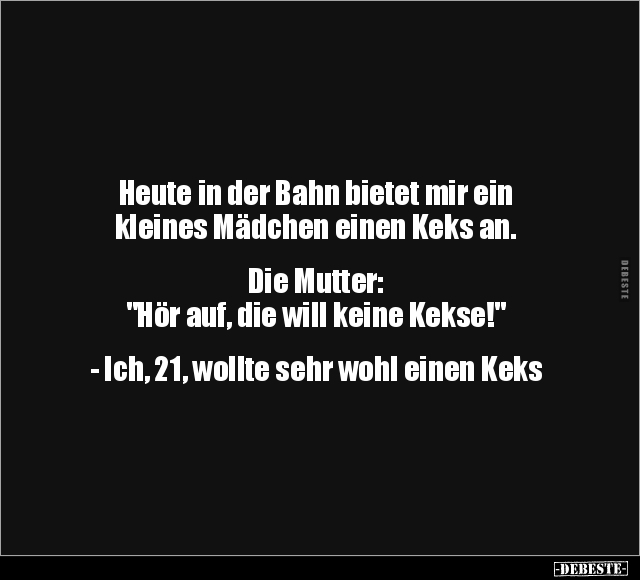 Heute in der Bahn bietet mir ein kleines Mädchen einen Keks an. Die Mutter: "Hör auf, die will keine Kekse!" - Ich, 21, wollte sehr wohl einen Keks