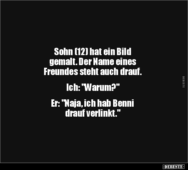 Sohn (12) hat ein Bild gemalt. Der Name eines Freundes steht auch drauf. Ich: "Warum?" Er: "Naja, ich hab Benni drauf verlinkt."