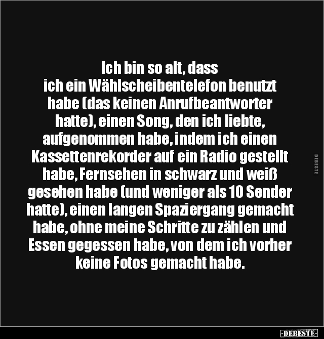 Ich bin so alt, dass ich ein Wählscheibentelefon benutzt habe (das keinen Anrufbeantworter hatte), einen Song, den ich liebte, aufgenommen habe, indem ich einen Kassettenrekorder auf ein Radio gestellt habe, Fernsehen in schwarz und weiß gesehen habe (und weniger als 10 Sender hatte), einen langen Spaziergang gemacht habe, ohne meine Schritte zu zählen und Essen gegessen habe, von dem ich vorher keine Fotos gemacht habe.