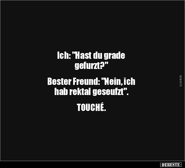 Ich: "Hast du grade gefurzt?" Bester Freund: "Nein, ich hab rektal geseufzt". TOUCHÉ.