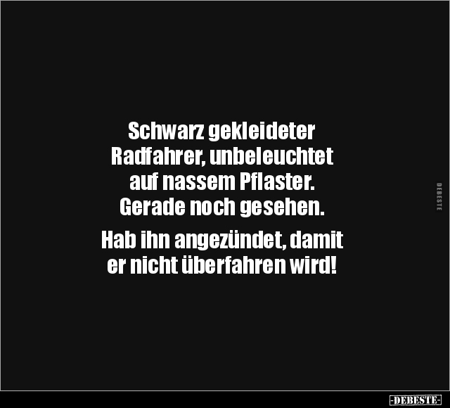Schwarz gekleideter Radfahrer, unbeleuchtet auf nassem Pflaster. Gerade noch gesehen. Hab ihn angezündet, damit er nicht überfahren wird!