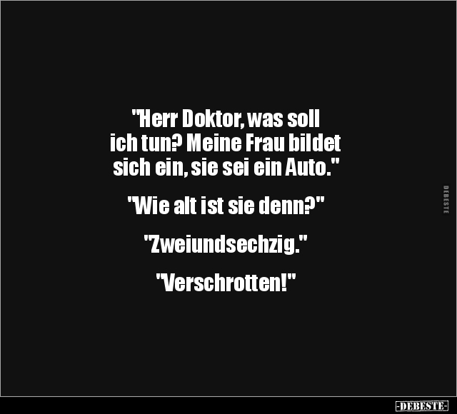 "Herr Doktor, was soll ich tun? Meine Frau bildet sich ein, sie sei ein Auto." "Wie alt ist sie denn?" "Zweiundsechzig." "Verschrotten!"