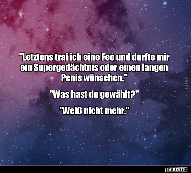 "Letztens traf ich eine Fee und durfte mir ein Supergedächtnis oder einen langen Penis wünschen." "Was hast du gewählt?" "Weiß nicht mehr."