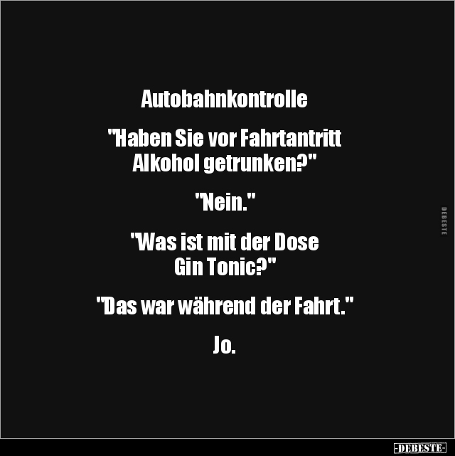 Autobahnkontrolle "Haben Sie vor Fahrtantritt Alkohol getrunken?" "Nein." "Was ist mit der Dose Gin Tonic?" "Das war während der Fahrt." Jo.