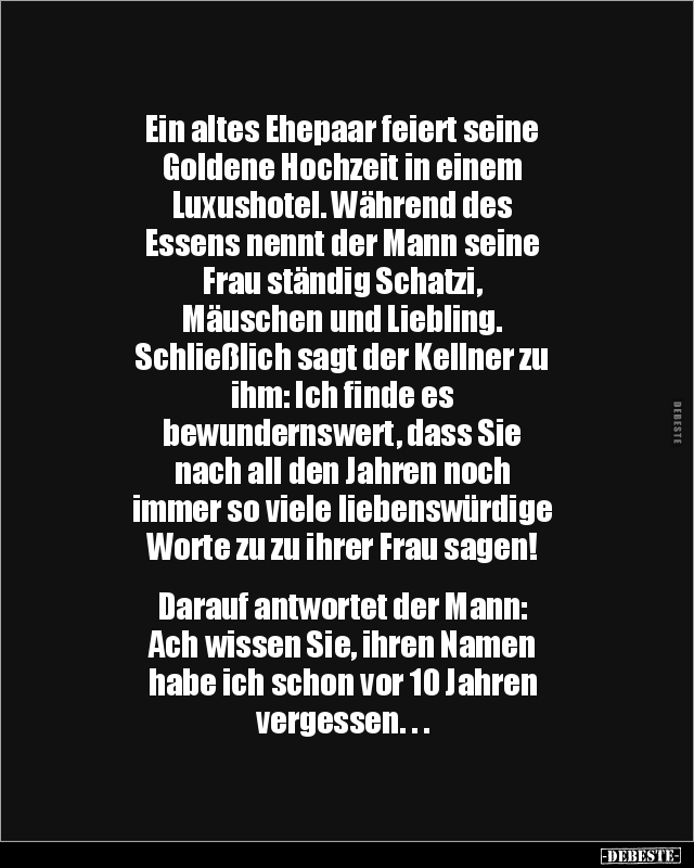 Ein altes Ehepaar feiert seine Goldene Hochzeit in einem Luxushotel. Während des Essens nennt der Mann seine Frau ständig Schatzi, Mäuschen und Liebling. Schließlich sagt der Kellner zu ihm: Ich finde es bewundernswert, dass Sie nach all den Jahren noch immer so viele liebenswürdige Worte zu zu ihrer Frau sagen! Darauf antwortet der Mann: Ach wissen Sie, ihren Namen habe ich schon vor 10 Jahren vergessen. . .