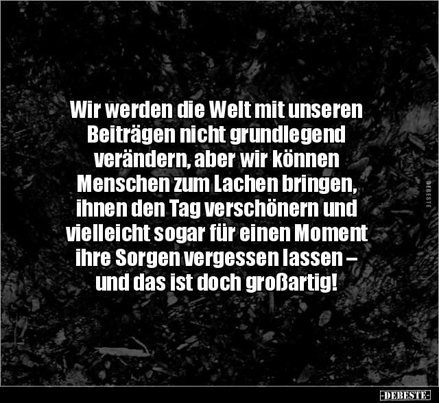 Wir werden die Welt mit unseren Beiträgen nicht grundlegend verändern, aber wir können Menschen zum Lachen bringen, ihnen den Tag verschönern und vielleicht sogar für einen Moment ihre Sorgen vergessen lassen – und das ist doch großartig!