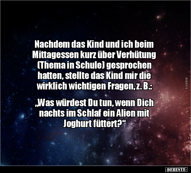 Nachdem das Kind und ich beim Mittagessen kurz über Verhütung (Thema in Schule) gesprochen hatten, stellte das Kind mir die wirklich wichtigen Fragen, z. B.: „Was würdest Du tun, wenn Dich nachts im Schlaf ein Alien mit Joghurt füttert?“