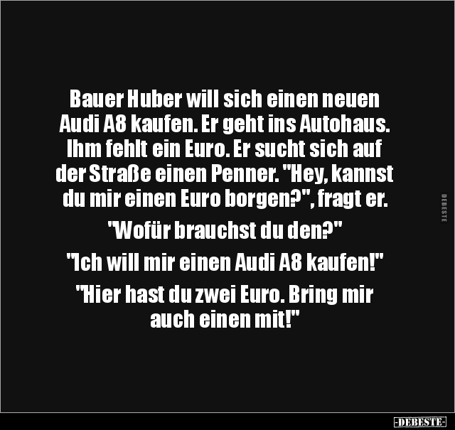 Bauer Huber will sich einen neuen Audi A8 kaufen. Er geht ins Autohaus. Ihm fehlt ein Euro. Er sucht sich auf der Straße einen Penner. "Hey, kannst du mir einen Euro borgen?", fragt er. "Wofür brauchst du den?" "Ich will mir einen Audi A8 kaufen!" "Hier hast du zwei Euro. Bring mir auch einen mit!"