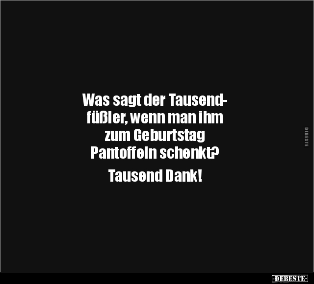 Was sagt der Tausend- füßler, wenn man ihm zum Geburtstag Pantoffeln schenkt? Tausend Dank!