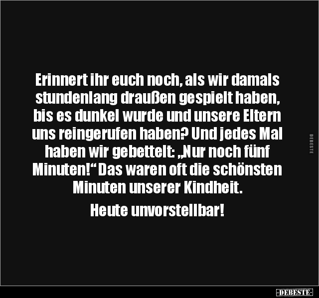Erinnert ihr euch noch, als wir damals stundenlang draußen gespielt haben, bis es dunkel wurde und unsere Eltern uns reingerufen haben? Und jedes Mal haben wir gebettelt: „Nur noch fünf Minuten!“ Das waren oft die schönsten Minuten unserer Kindheit. Heute unvorstellbar!