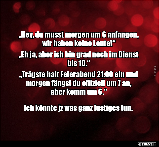 „Hey, du musst morgen um 6 anfangen, wir haben keine Leute!“ „Eh ja, aber ich bin grad noch im Dienst bis 10.“ „Trägste halt Feierabend 21:00 ein und morgen fängst du offiziell um 7 an, aber komm um 6.“ Ich könnte jz was ganz lustiges tun.