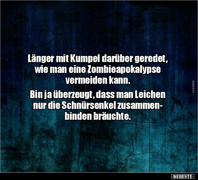 Länger mit Kumpel darüber geredet, wie man eine Zombieapokalypse vermeiden kann. Bin ja überzeugt, dass man Leichen nur die Schnürsenkel zusammen- binden bräuchte.