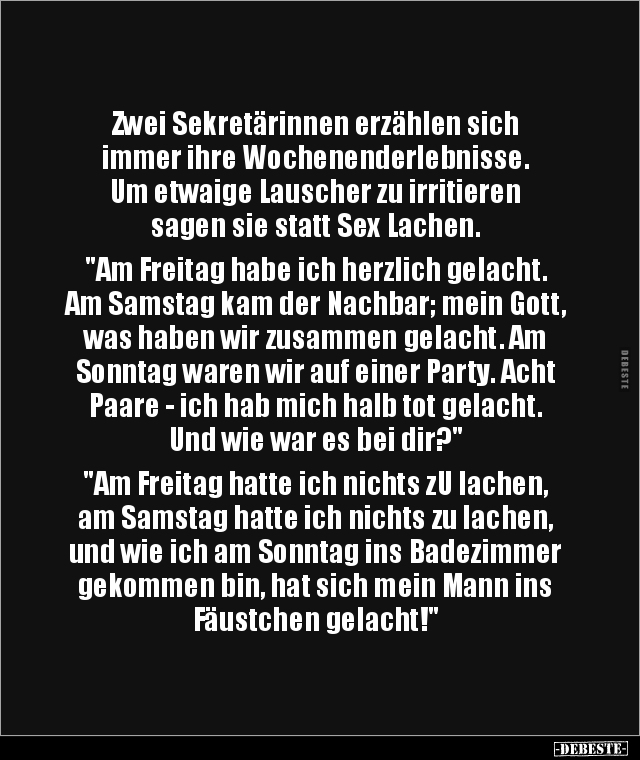 Zwei Sekretärinnen erzählen sich immer ihre Wochenenderlebnisse. Um etwaige Lauscher zu irritieren sagen sie statt Sex Lachen. "Am Freitag habe ich herzlich gelacht. Am Samstag kam der Nachbar; mein Gott, was haben wir zusammen gelacht. Am Sonntag waren wir auf einer Party. Acht Paare - ich hab mich halb tot gelacht. Und wie war es bei dir?" "Am Freitag hatte ich nichts zU lachen, am Samstag hatte ich nichts zu lachen, und wie ich am Sonntag ins Badezimmer gekommen bin, hat sich mein Mann ins Fäustchen gelacht!"