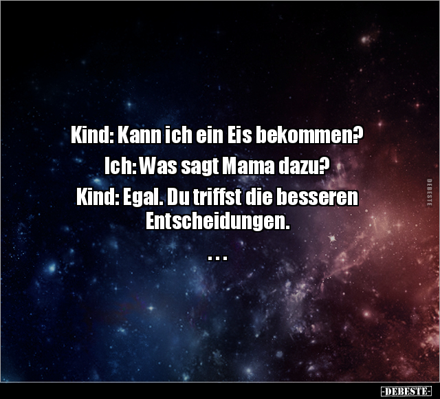 Kind: Kann ich ein Eis bekommen? Ich: Was sagt Mama dazu? Kind: Egal. Du triffst die besseren Entscheidungen. . . .