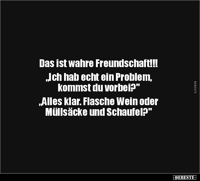 Das ist wahre Freundschaft!!! „Ich hab echt ein Problem, kommst du vorbei?" „Alles klar. Flasche Wein oder Müllsäcke und Schaufel?"