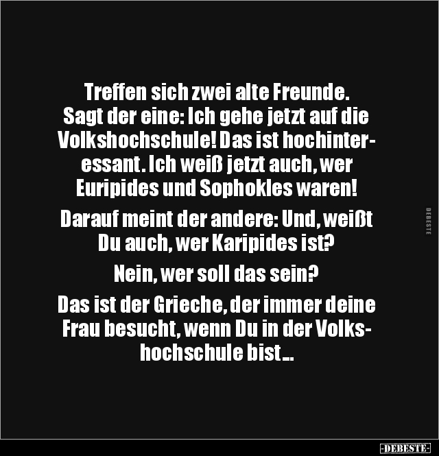 Treffen sich zwei alte Freunde. Sagt der eine: Ich gehe jetzt auf die Volkshochschule! Das ist hochinter- essant. Ich weiß jetzt auch, wer Euripides und Sophokles waren! Darauf meint der andere: Und, weißt Du auch, wer Karipides ist? Nein, wer soll das sein? Das ist der Grieche, der immer deine Frau besucht, wenn Du in der Volks- hochschule bist...