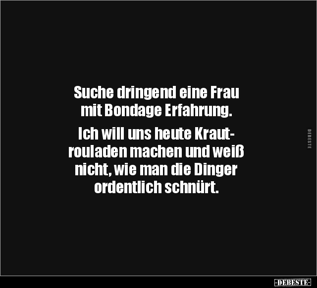 Suche dringend eine Frau mit Bondage Erfahrung. Ich will uns heute Kraut- rouladen machen und weiß nicht, wie man die Dinger ordentlich schnürt.