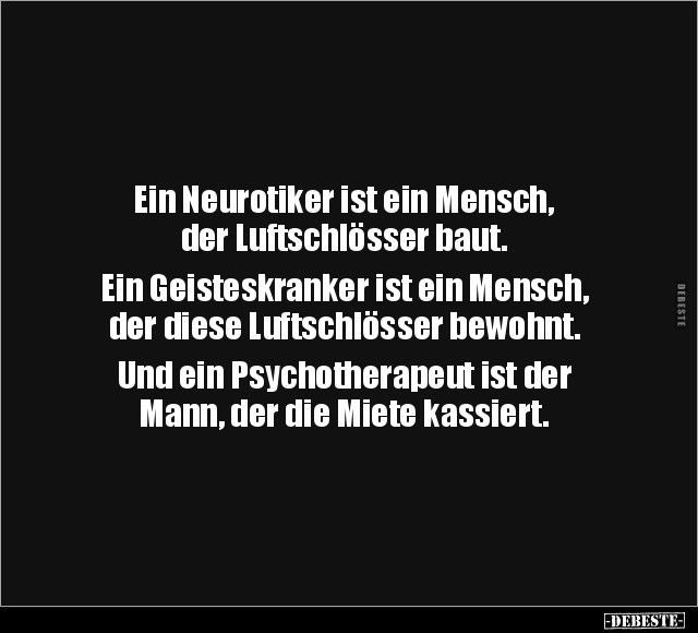 Ein Neurotiker ist ein Mensch, der Luftschlösser baut. Ein Geisteskranker ist ein Mensch, der diese Luftschlösser bewohnt. Und ein Psychotherapeut ist der Mann, der die Miete kassiert.