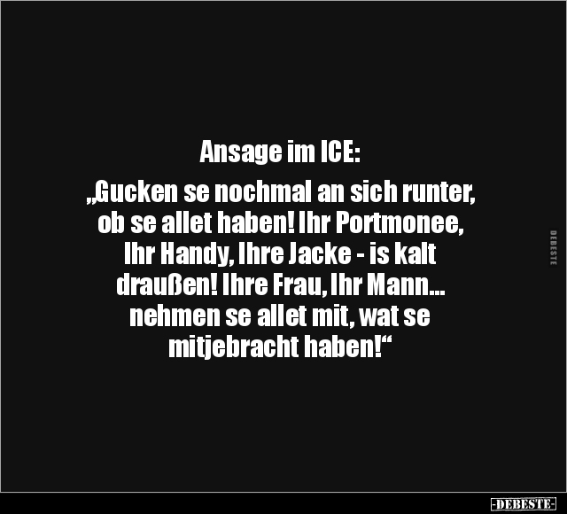 Ansage im ICE: „Gucken se nochmal an sich runter, ob se allet haben! Ihr Portmonee, Ihr Handy, Ihre Jacke - is kalt draußen! Ihre Frau, Ihr Mann… nehmen se allet mit, wat se mitjebracht haben!“