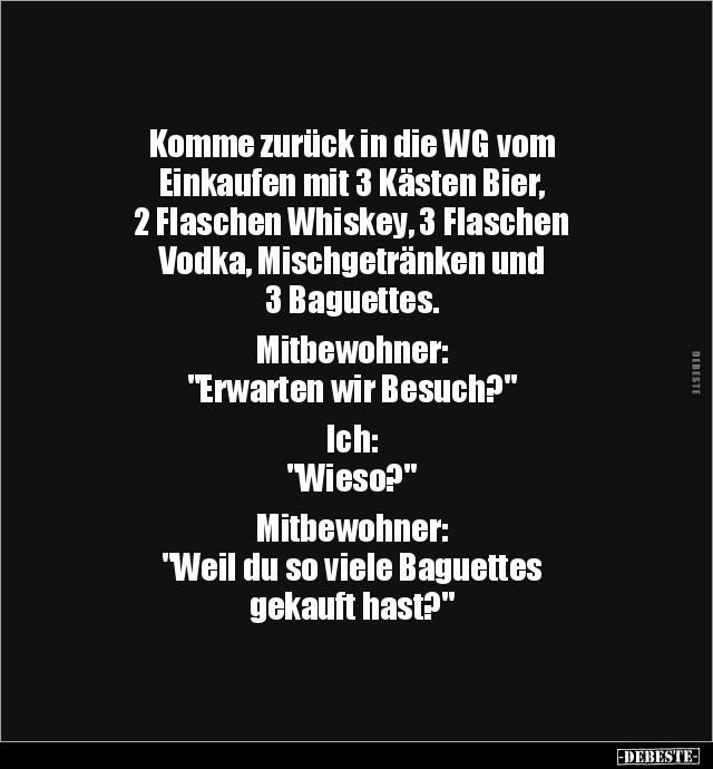 Komme zurück in die WG vom Einkaufen mit 3 Kästen Bier, 2 Flaschen Whiskey, 3 Flaschen Vodka, Mischgetränken und 3 Baguettes. Mitbewohner: "Erwarten wir Besuch?" Ich: "Wieso?" Mitbewohner: "Weil du so viele Baguettes gekauft hast?"