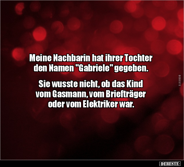 Meine Nachbarin hat ihrer Tochter den Namen "Gabriele" gegeben. Sie wusste nicht, ob das Kind vom Gasmann, vom Briefträger oder vom Elektriker war.