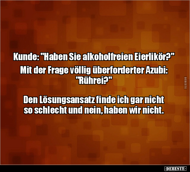 Kunde: "Haben Sie alkoholfreien Eierlikör?" Mit der Frage völlig überforderter Azubi: "Rührei?" Den Lösungsansatz finde ich gar nicht so schlecht und nein, haben wir nicht.