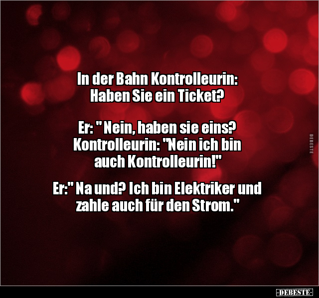In der Bahn Kontrolleurin: Haben Sie ein Ticket? Er: " Nein, haben sie eins? Kontrolleurin: "Nein ich bin auch Kontrolleurin!" Er:" Na und? Ich bin Elektriker und zahle auch für den Strom."