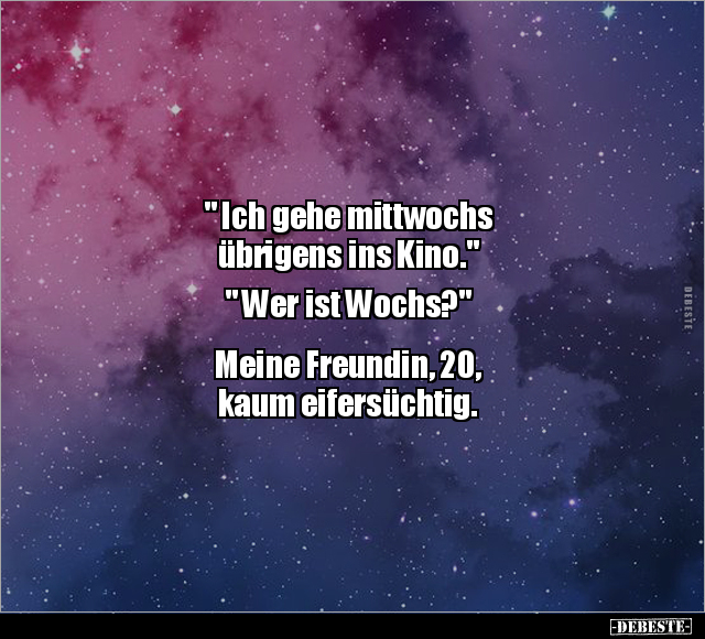 " Ich gehe mittwochs übrigens ins Kino." " Wer ist Wochs?" Meine Freundin, 20, kaum eifersüchtig.