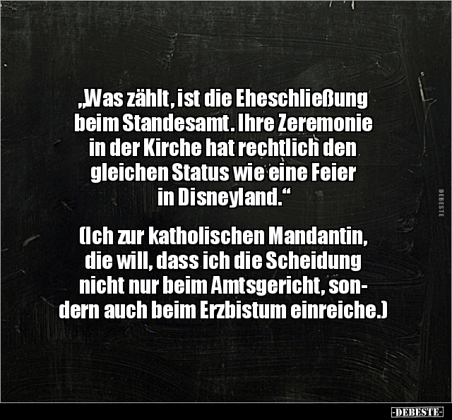 „Was zählt, ist die Eheschließung beim Standesamt. Ihre Zeremonie in der Kirche hat rechtlich den gleichen Status wie eine Feier in Disneyland.“ (Ich zur katholischen Mandantin, die will, dass ich die Scheidung nicht nur beim Amtsgericht, son- dern auch beim Erzbistum einreiche.)