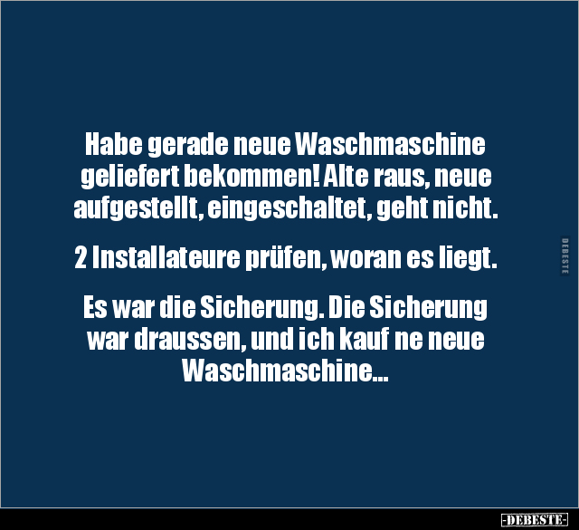 Habe gerade neue Waschmaschine geliefert bekommen! Alte raus, neue aufgestellt, eingeschaltet, geht nicht. 2 Installateure prüfen, woran es liegt. Es war die Sicherung. Die Sicherung war draussen, und ich kauf ne neue Waschmaschine...
