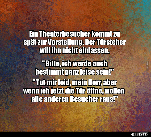 Ein Theaterbesucher kommt zu spät zur Vorstellung. Der Türsteher will ihn nicht einlassen. " Bitte, ich werde auch bestimmt ganz leise sein!" " Tut mir leid, mein Herr, aber wenn ich jetzt die Tür öffne, wollen alle anderen Besucher raus!"
