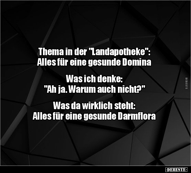 Thema in der "Landapotheke": Alles für eine gesunde Domina Was ich denke: "Ah ja. Warum auch nicht?" Was da wirklich steht: Alles für eine gesunde Darmflora