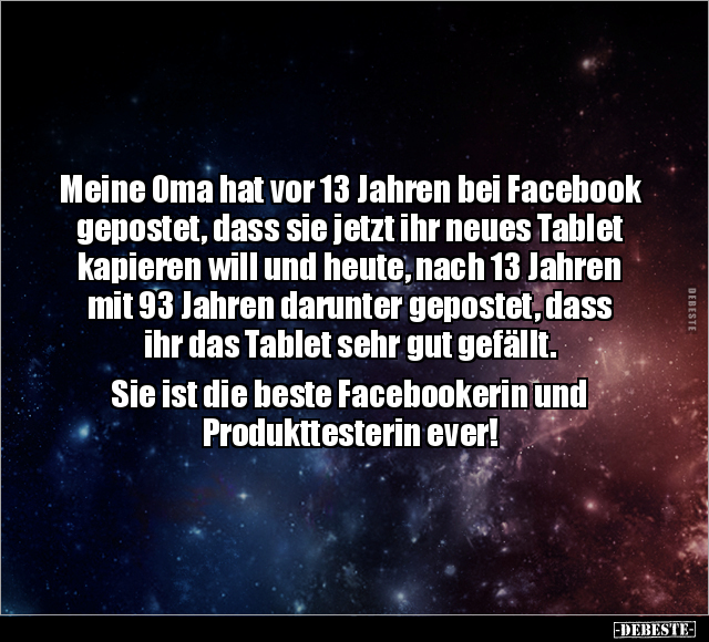 Meine Oma hat vor 13 Jahren bei Facebook gepostet, dass sie jetzt ihr neues Tablet kapieren will und heute, nach 13 Jahren mit 93 Jahren darunter gepostet, dass ihr das Tablet sehr gut gefällt. Sie ist die beste Facebookerin und Produkttesterin ever!