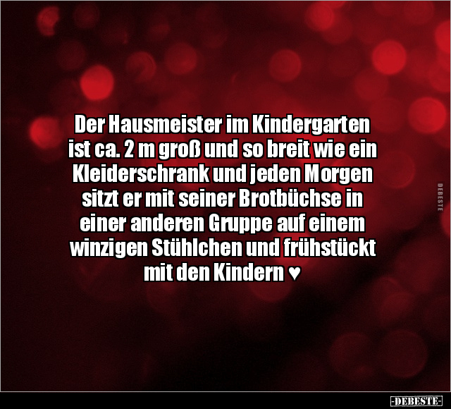 Der Hausmeister im Kindergarten ist ca. 2 m groß und so breit wie ein Kleiderschrank und jeden Morgen sitzt er mit seiner Brotbüchse in einer anderen Gruppe auf einem winzigen Stühlchen und frühstückt mit den Kindern ♥