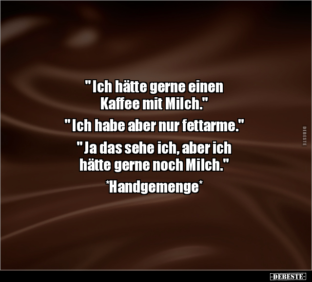 " Ich hätte gerne einen Kaffee mit Milch." " Ich habe aber nur fettarme." " Ja das sehe ich, aber ich hätte gerne noch Milch." *Handgemenge*