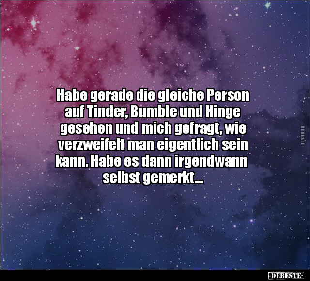 Habe gerade die gleiche Person auf Tinder, Bumble und Hinge gesehen und mich gefragt, wie verzweifelt man eigentlich sein kann. Habe es dann irgendwann selbst gemerkt...