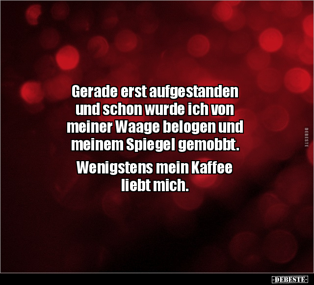 Gerade erst aufgestanden und schon wurde ich von meiner Waage belogen und meinem Spiegel gemobbt. Wenigstens mein Kaffee liebt mich.
