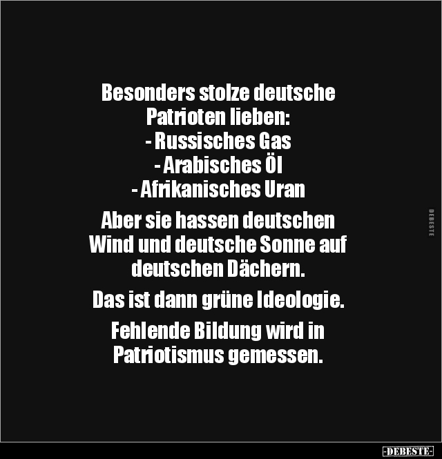 Besonders stolze deutsche Patrioten lieben: - Russisches Gas - Arabisches Öl - Afrikanisches Uran Aber sie hassen deutschen Wind und deutsche Sonne auf deutschen Dächern. Das ist dann grüne Ideologie. Fehlende Bildung wird in Patriotismus gemessen.