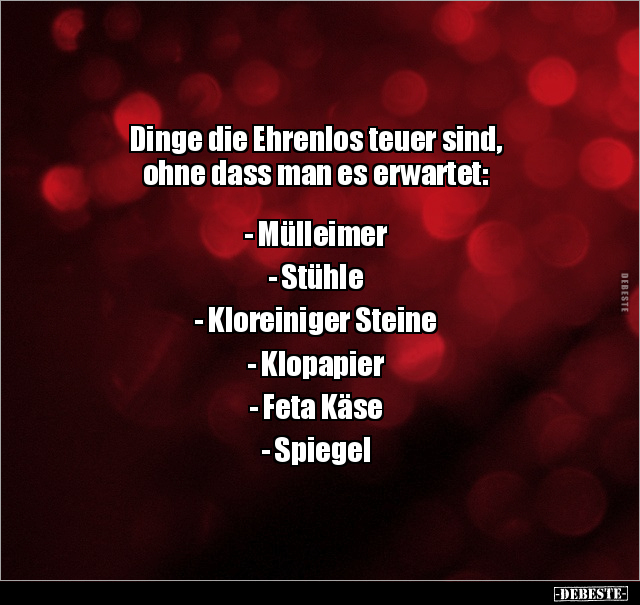 Dinge die Ehrenlos teuer sind, ohne dass man es erwartet: - Mülleimer - Stühle - Kloreiniger Steine - Klopapier - Feta Käse - Spiegel