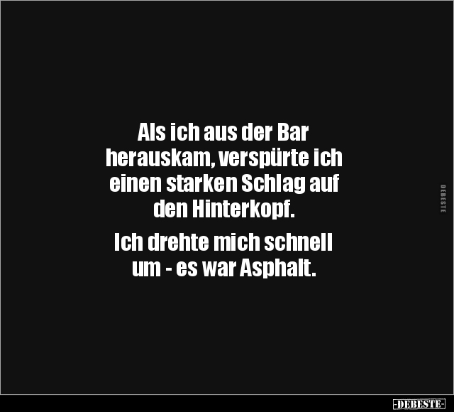Als ich aus der Bar herauskam, verspürte ich einen starken Schlag auf den Hinterkopf. Ich drehte mich schnell um - es war Asphalt.