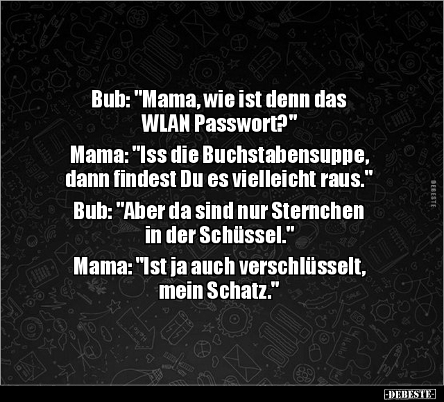 Bub: "Mama, wie ist denn das WLAN Passwort?" Mama: "Iss die Buchstabensuppe, dann findest Du es vielleicht raus." Bub: "Aber da sind nur Sternchen in der Schüssel." Mama: "Ist ja auch verschlüsselt, mein Schatz."