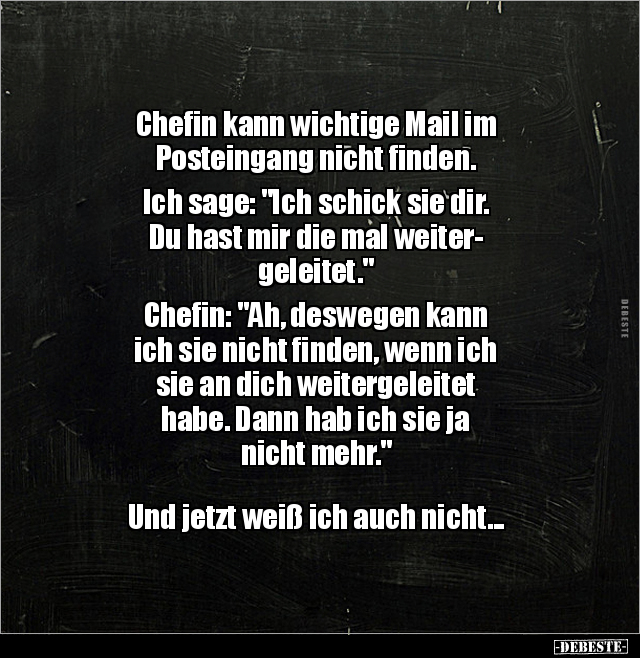 Chefin kann wichtige Mail im Posteingang nicht finden. Ich sage: "Ich schick sie dir. Du hast mir die mal weiter- geleitet." Chefin: "Ah, deswegen kann ich sie nicht finden, wenn ich sie an dich weitergeleitet habe. Dann hab ich sie ja nicht mehr." Und jetzt weiß ich auch nicht...